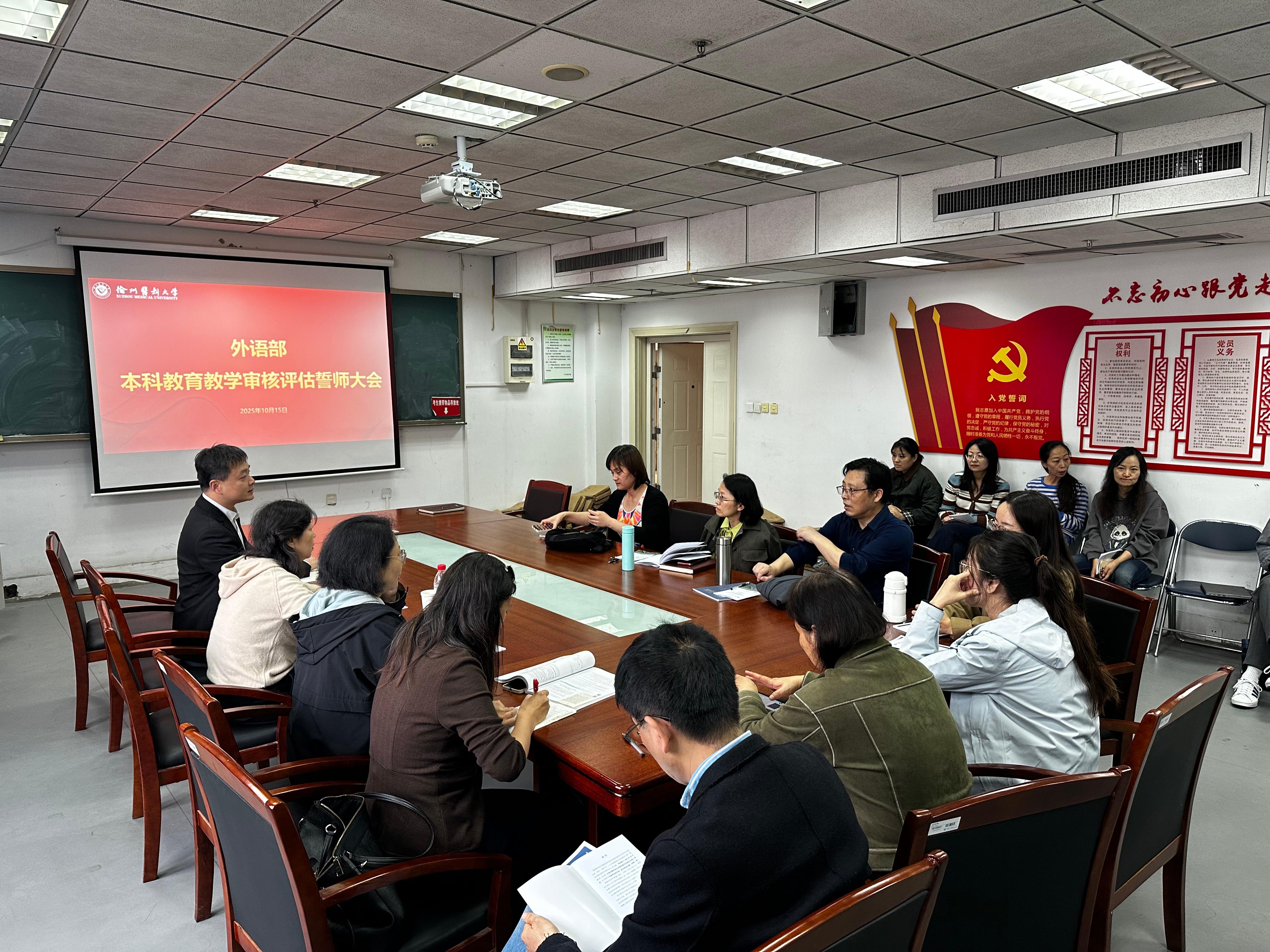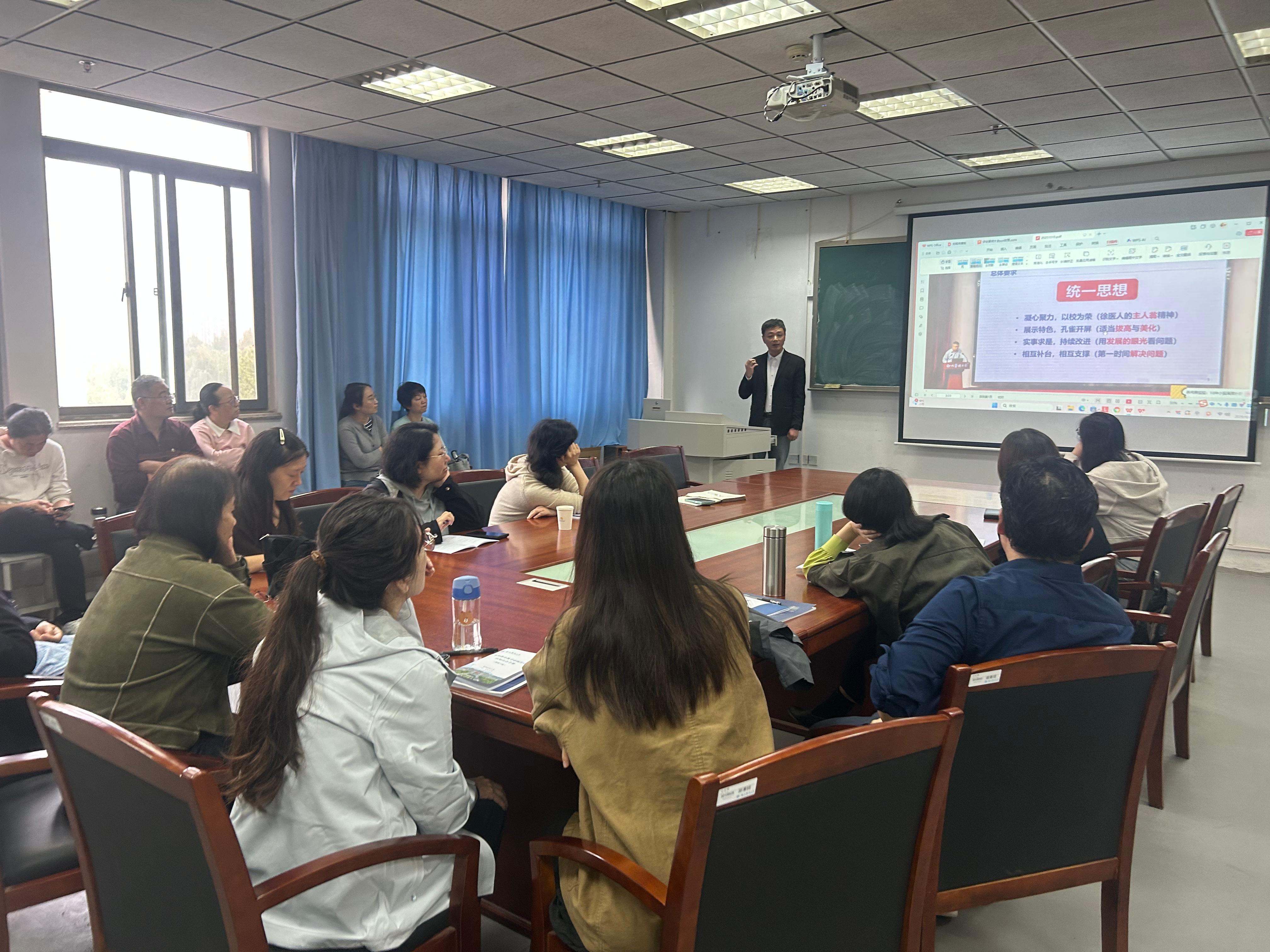 会议还组织全体教职工集中学习了《本科教育教学审核评估应知应会(教职工版)》。参会教师围绕审核评估的“新内涵”“五自质量文化”“五个度”等核心内容展开学习,就课程思政融入、医学英语能力培养、教学档案规范等展开交流,明确将以“金课”标准提升教学质量,做好教学材料规范化。