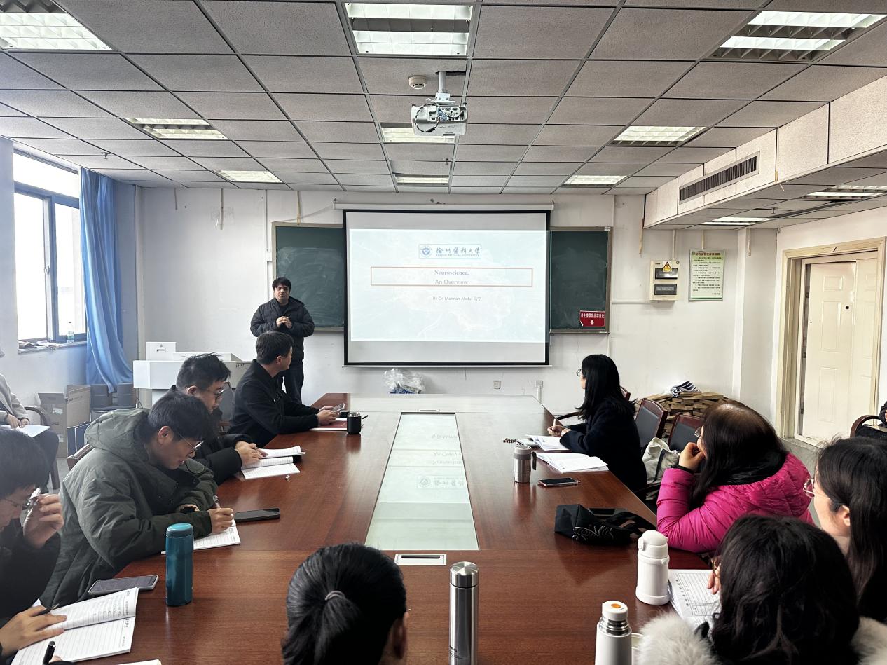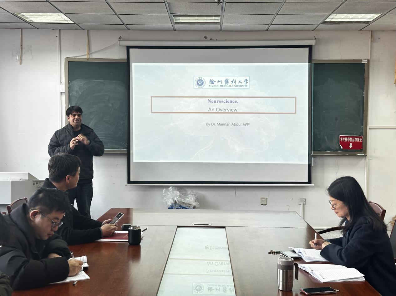 12月17日,外语部为医学英语教师举办医学知识讲座,特邀外教Dr. Mannan Abdul(马宁)主讲“神经科学概述”。讲座由外语部副主任朱九扬主持,旨在帮助外语教师理解基础医学概念,以更好地服务于医学英语教学。