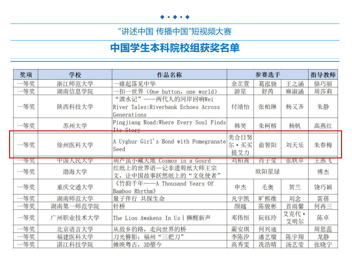 第八届“外教社杯”全国高校学生跨文化能力大赛近日落下帷幕,该项赛事分为短视频和团队现场赛两种比赛形式,我校学子美合日努尔·买买提艾力(医学影像学院)、俞智阳(麻醉学院)、刘天乐(第一临床医学院)团队作品,在短视频大赛全国2500余作品中脱颖而出,荣获国赛一等奖,在团队现场赛中,孔陆依(麻醉学院)、孙翊(第一临床医学院)、赵陆明阳(第二临床医学院)荣获省赛一等奖。